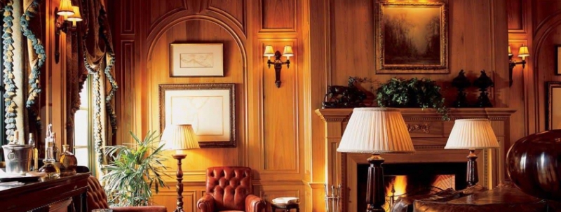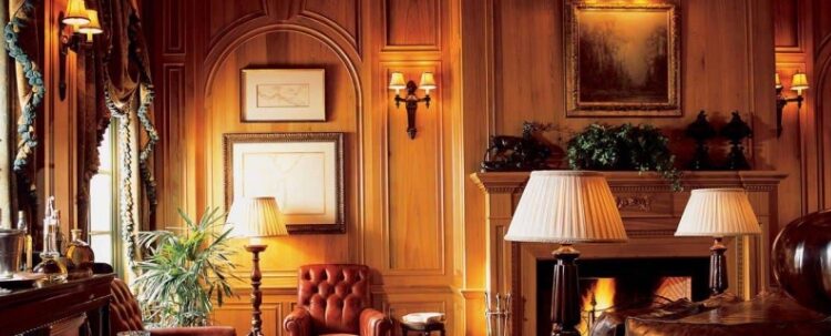 Центром комнаты становится камин, который может быть настоящим или искусственным. В интерьере используются плотные обои с мелким цветочным принтом или строгой полоской, открытые полки и ниши для хранения книг и аксессуаров. Мягкая мебель представлена традиционным диваном «Честерфилд».