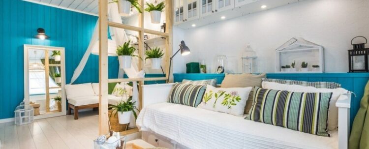 Для морского пляжного стиля отлично подойдут не только светлые тона. Но и насыщенные и глубокие синие оттенки, оттенки зеленого и бирюзового, которые будут ассоциироваться с растениями, зеленью, которая растет на побережье.