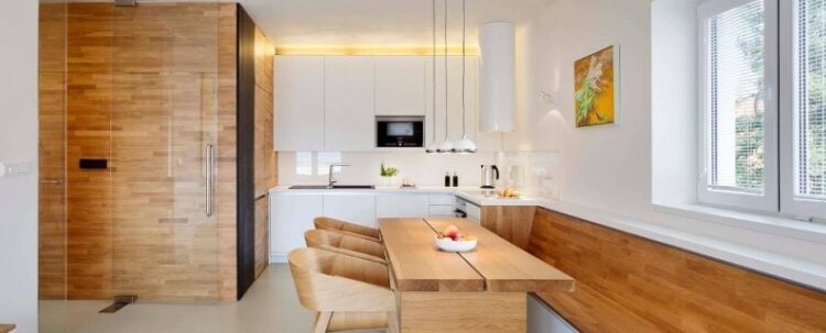 Скамья на кухне используется в комплекте с кухонным столом, чтобы максимально освободить полезную площадь комнаты. Поэтому данный предмет мебели считается оптимальным вариантом для маленьких кухонь.
