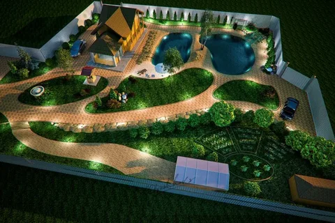 Проектируются системы полива, дренажа, освещения, возможное размещение розеток, водопроводов и иных коммуникаций. Грамотная инженерия избавляет владельца от луж, пересохших газонов и проблем с обслуживанием.