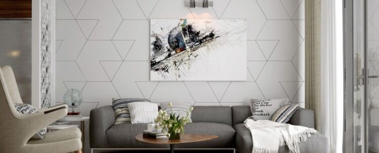 Вместо простых квадратиков, треугольников и кружочков в геометрических принтах сейчас используют абстрактные изображениях из ломанных линий и фигур. Узоры дополняют металлизированными деталями, яркой цветовой гаммой, сочетают с разными техниками и узорами. Рисунок получается ярким и может быть слегка навязчивым. Поэтому он рекомендован только для акцентных стен.
