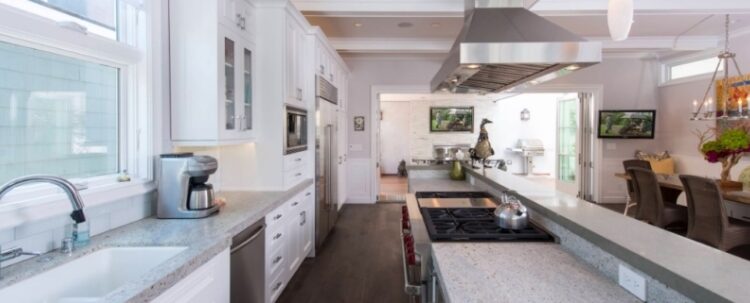 Подразумевается расстановка мебельного гарнитура вдоль одной из длинных сторон. Подобное обустройство используют для кухонь с большой и средней площадью, а также в помещениях, где необходимо оставить достаточно места для обеденной зоны. Впрочем, вариант барной стойки вдаль стены имеет место быть и в данном случае, если разместить ее напротив гарнитура.